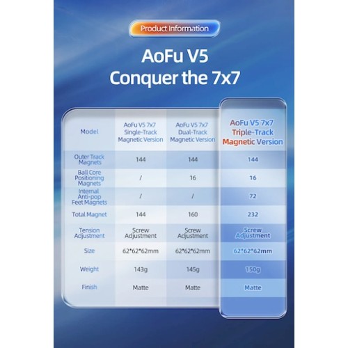 The AoFu V5 Triple Track is a magnetic MoYu 7x7 with a ball-core system. It’s listed as 62 mm, with weight commonly around 150 g (some listings show 152 g). Triple-Track uses 232 factory-installed magnets: 144 outer-track + 16 ball-core + 72 internal anti-pop feet magnets for extra precision on every turn.