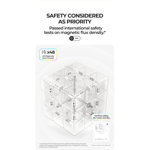 Magnetisation: 48 built-in magnets placed in the pieces create a stable but not overly strong layer alignment and help the cube self-align after turns.